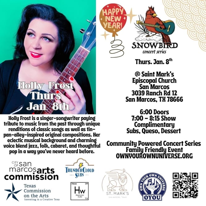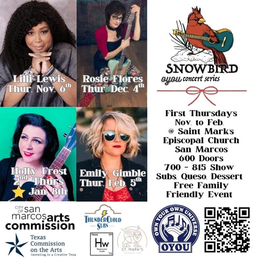 The Snowbird Concert Series is a free, all-ages music program presented by the nonprofit OYOU (Own Your Own Universe), held on the first Thursday of each month from November through February. Designed to enrich the cultural life of Central Texas during the winter months, the series features high-quality performances by both local and touring artists. Each concert also includes a unique Q&A segment, allowing the audience to engage directly with performers—fostering connection, inspiration, and a deeper appreciation for the creative process.